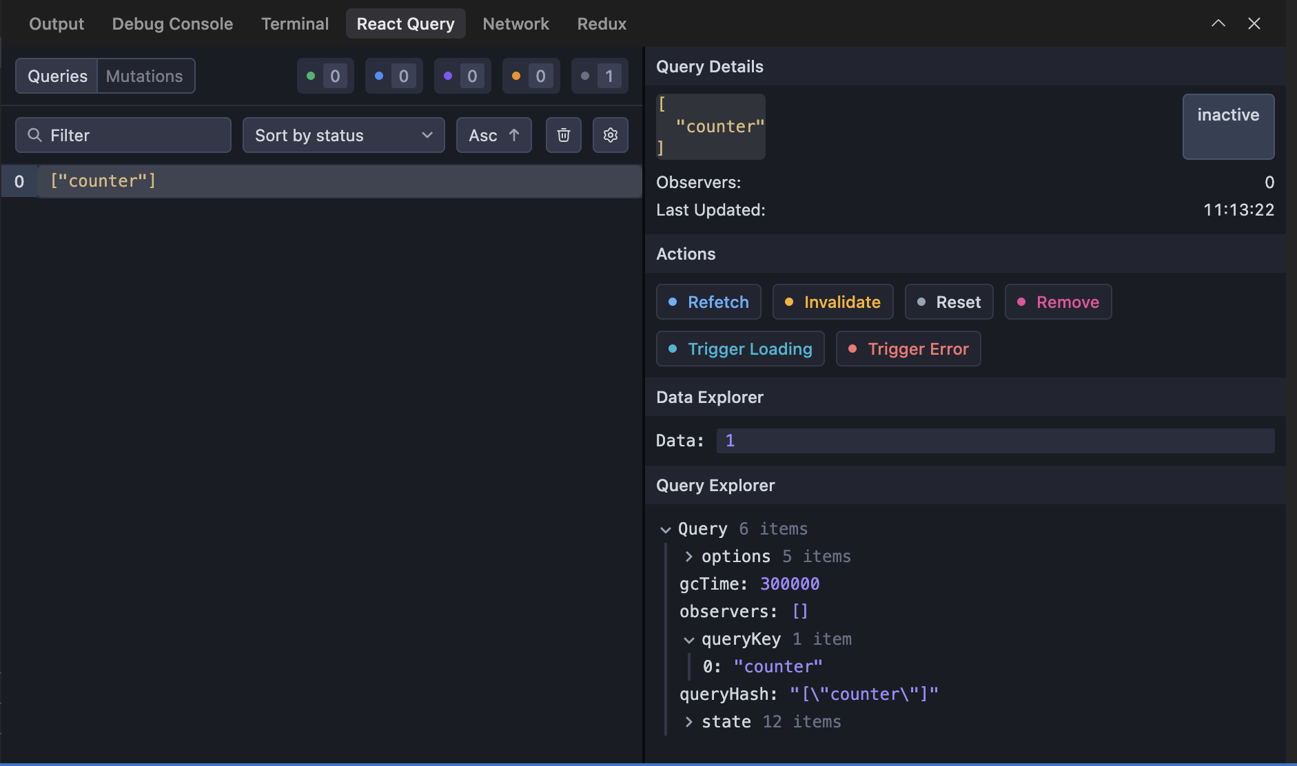 This plugin doesn't require any additional configuration. When the IDE detects your app uses React Query, the plugin will be listed in the Dev Tools menu. Once enabled you can use the official React Query's devtool UI from within the editor panel: