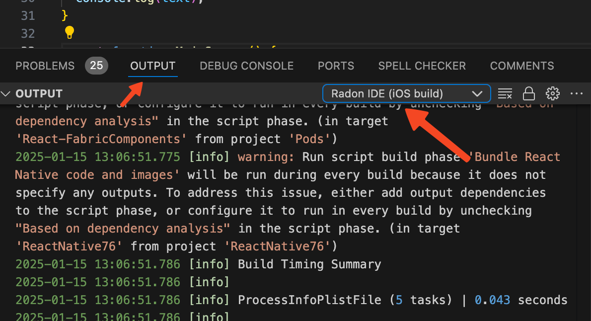 Native builds are one of the most time consuming phases when launching your project. Build processes output a lot of logs on their own and hence they have separate output channels. When something goes wrong in the native build phase, instead of checking "Radon IDE" source in "Output Panel" as described in the previous point, select "Radon IDE (Android build)" or "Radon IDE (iOS build)" source depending on the platform you're building for.