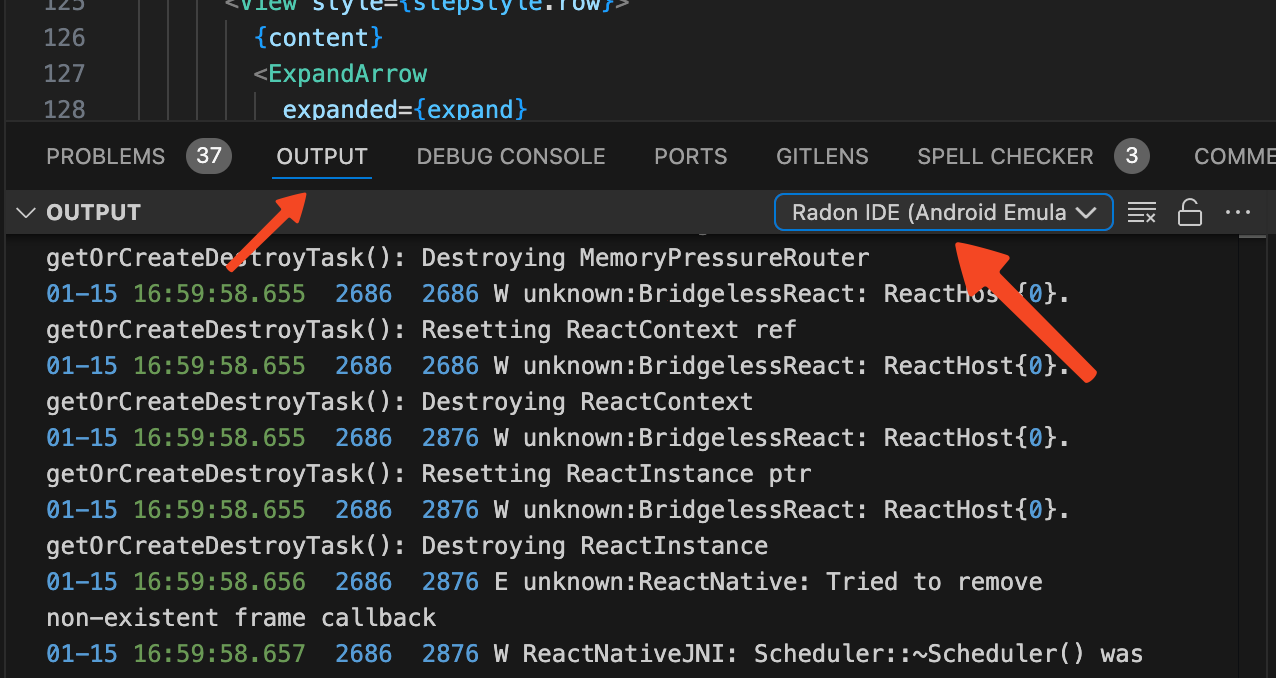 In cases of native crashes on iOS or Android, it may be helpful to investigate those by checking iOS process output, or Android logcat. When the application is launched, Radon IDE creates a separate output channel to record logs printed by the application process. In order to see it, you can go to "Output" panel and select "Radon IDE (iOS Simulator Logs)" for logs from your iOS application process or "Radon IDE (Android Emulator Logs)" to see android's logcat entries associated with your app.